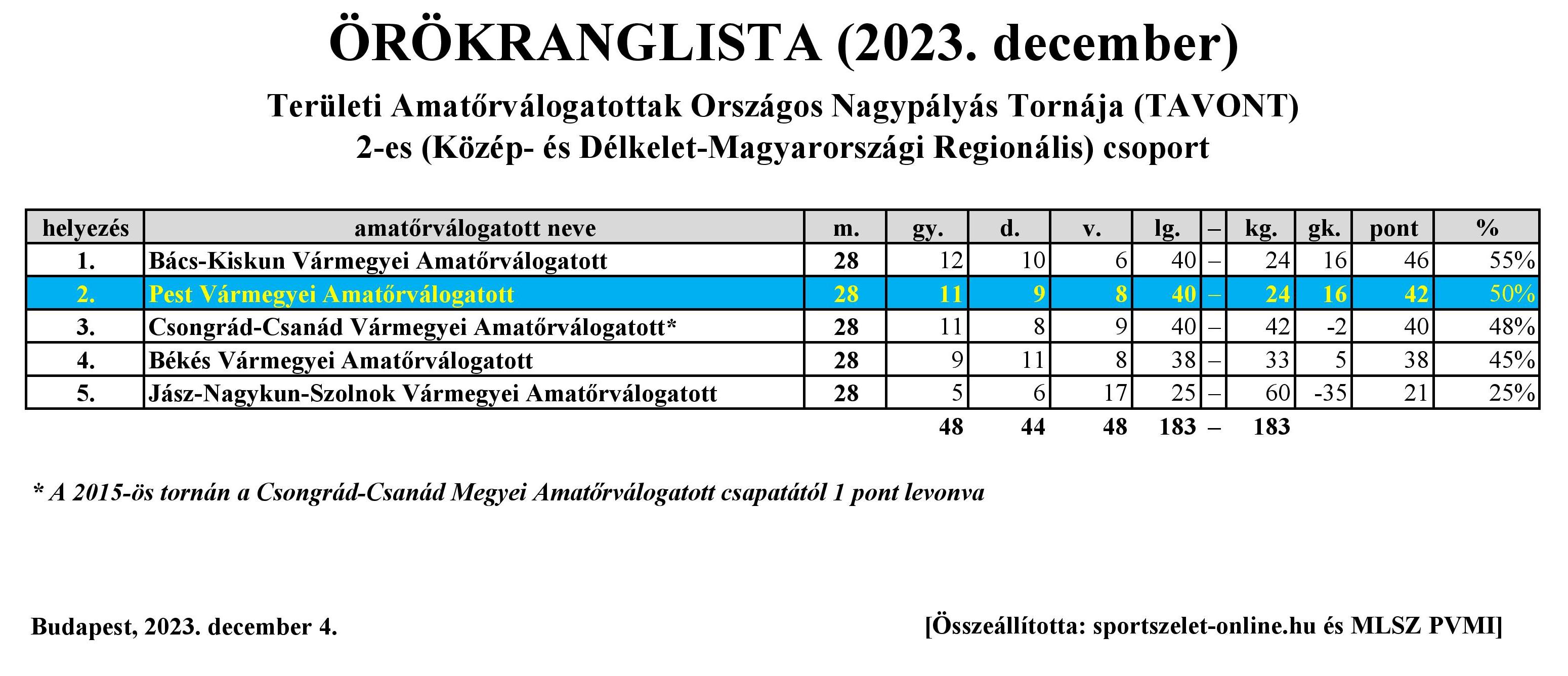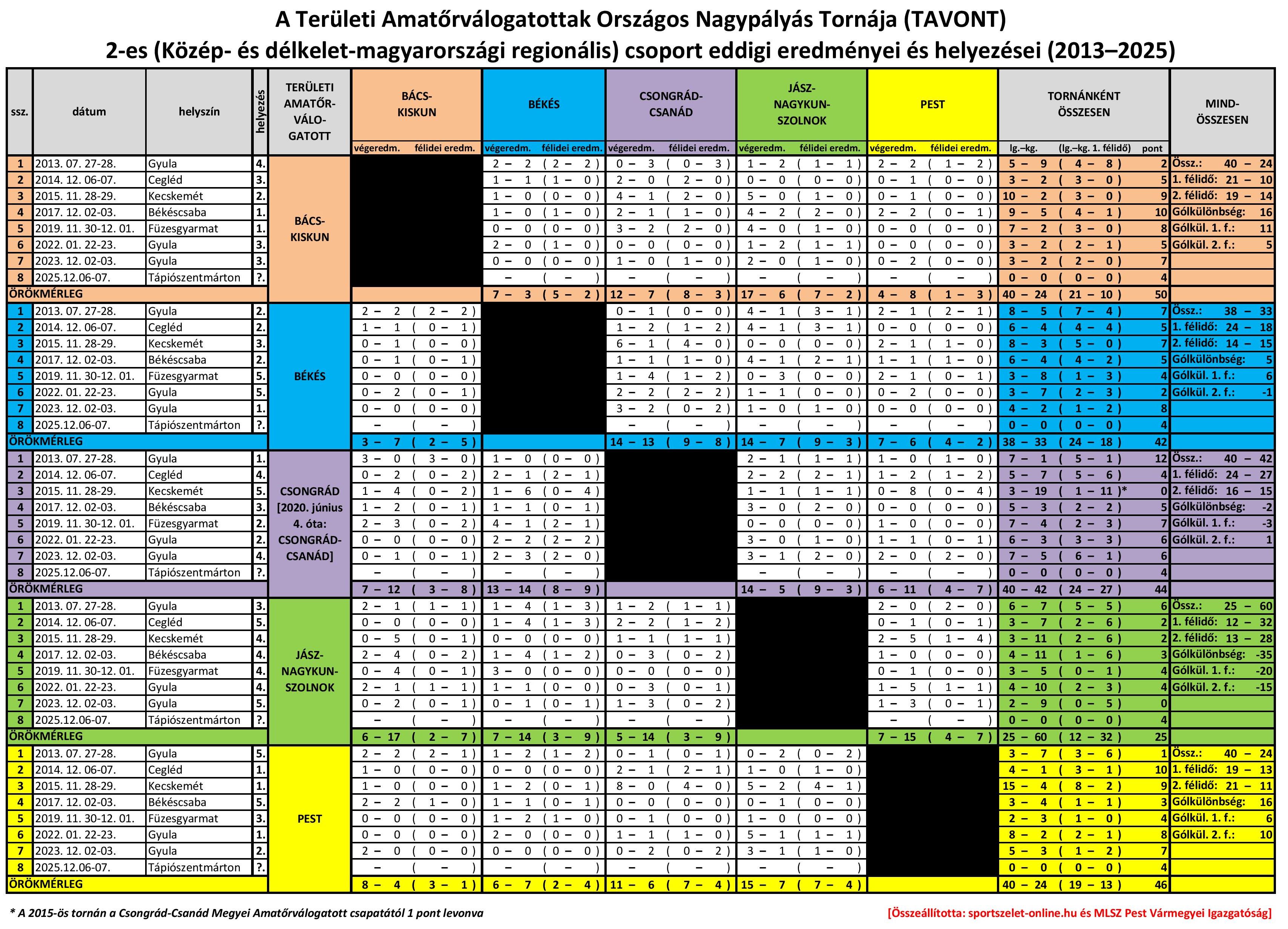 [A mellékelt illusztrációk közül a mátrixtáblázatban a Pest vármegyei amatőrválogatott által érdekelt 2-es selejtezőcsoport eddigi 7 tornájának valamennyi eredménye és az egyes tornákon az öt résztvevő által elért helyezés is látható – sok-sok egyéb kiolvasható érdekesség mellett; míg a másik táblázatban a 7 torna során rendezett összesen 70 – csapatonként 28-28 – mérkőzés alapján összeállított örökranglista látható.]